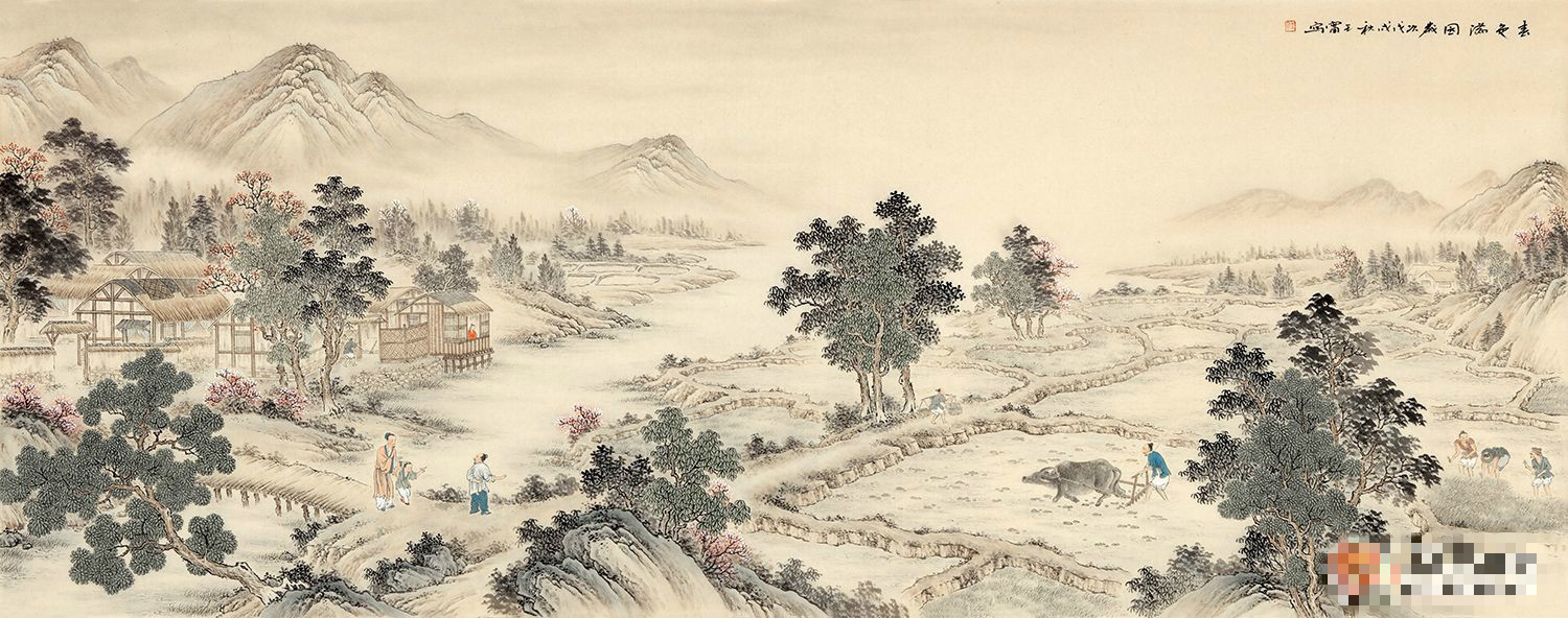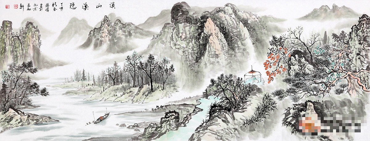 【赏析】此作山峦层叠,绿树苍翠,白云涌起,水际空灵。以仿古手法设色,用笔精工,构景得疏密动静之妙,画面明净雅逸。房屋依山傍水,景色宜人,人物极小却刻画的极为细致,山径蜿蜒时隐时现,曲径通幽,江旷平远,悠长恬淡之境。远景山云缥缈氤氲,别具延伸之感。笔墨纯熟,温雅深朴,意境悠然,透露出老师雅士恬淡,淡泊名利,闲云野鹤般与世无争的心境。是不可多得的雅俗共赏之作,适合悬挂在客厅、茶室、会所等地,彰显品位且增添室内的书香气息。