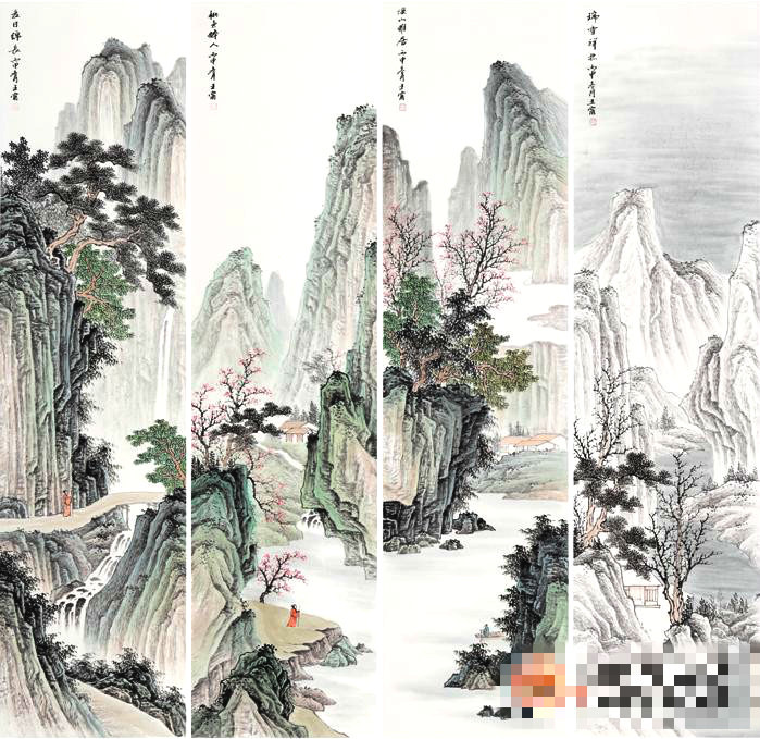 【中国风的山水画四条屏,挂着很有艺术气息,画中体现的小桥流水人家,远处的山峰都描绘的淋漓精致,挂在家里显得端庄大气。】